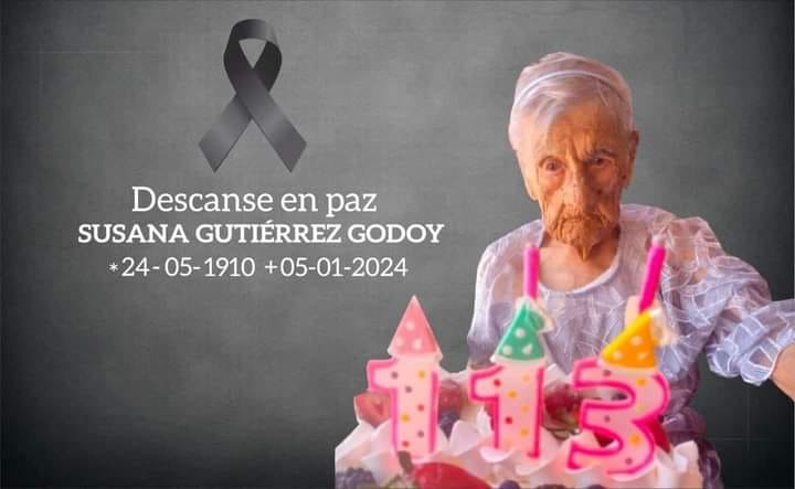 The GRG is saddened to report the death of Susana Gutierrez Godoy. Born May 24th 1910 in Mexico, Susana married twice. She married first at age 21 in 1932 but was widowed in 1933. She married again in 1939 at age 29. Susana had one child, a daughter, that sadly died at 3 months of age. She had no more children after this. Susana was very independent and active, still cooking for herself at age 100. She passed away in a care facility in Mexico, in the same town she was born in, on January 5th 2024, aged 113 years, 226 days. Susana was the oldest known living person in Mexico before her passing.