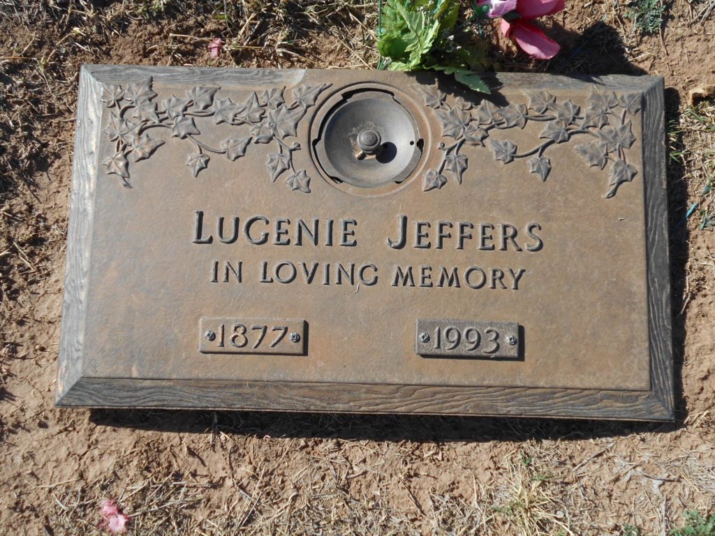 Lugenie married Will Gibson around 1901 in Oklahoma and continued to live there for some time. On August 28 1928, she married Shelby J Jeffers in Harmon, Oklahoma. In total, it appears Lugenie had around seven children – some from each marriage.