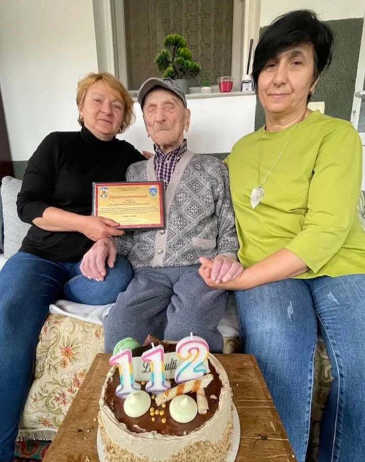 Ilie Ciocan with his granddaughters Camelia and Mirela on his 112th birthday in 2025.
