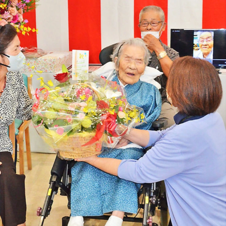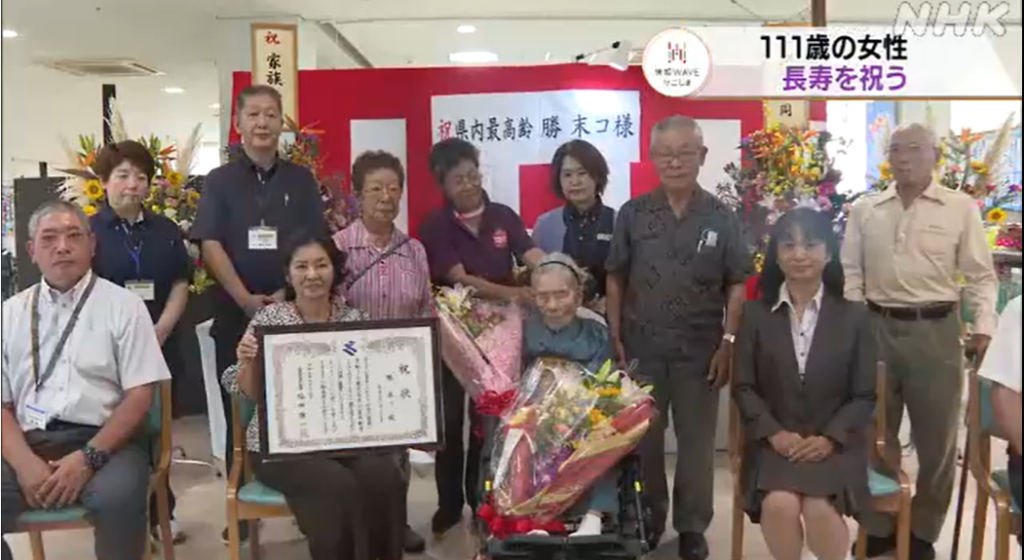 On 15 September 2023, she received a special visit from the Director of the Oshima Branch of the Tokyo Metropolitan Government and was congratulated for being the oldest person in Kagoshima Prefecture.